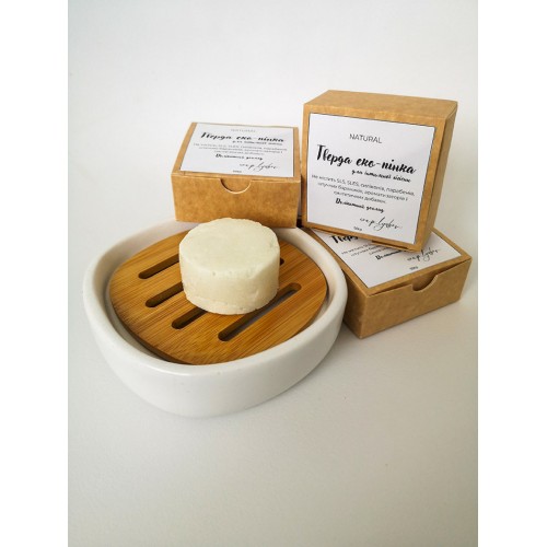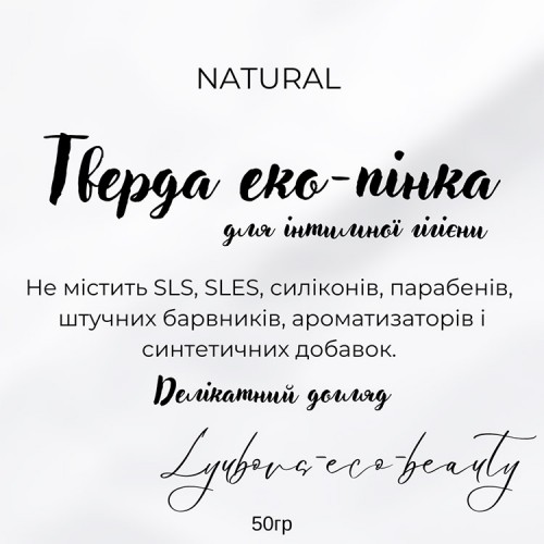 Тверда еко-пінка для інтимної гігієни м’яко та делікатно очищує чутливу шкіру, заспокоює, усуває запалення і запобігає розвитку хвороботворних інфекцій, захищає слизову оболонку від подразнень. Засіб містить м'які ПАР, які делікатно очищають, а також компоненти, що зволожують, заспокоюють і підтримують природний pH-баланс. Екстракти ромашки та шавлії додають антисептичні властивості.